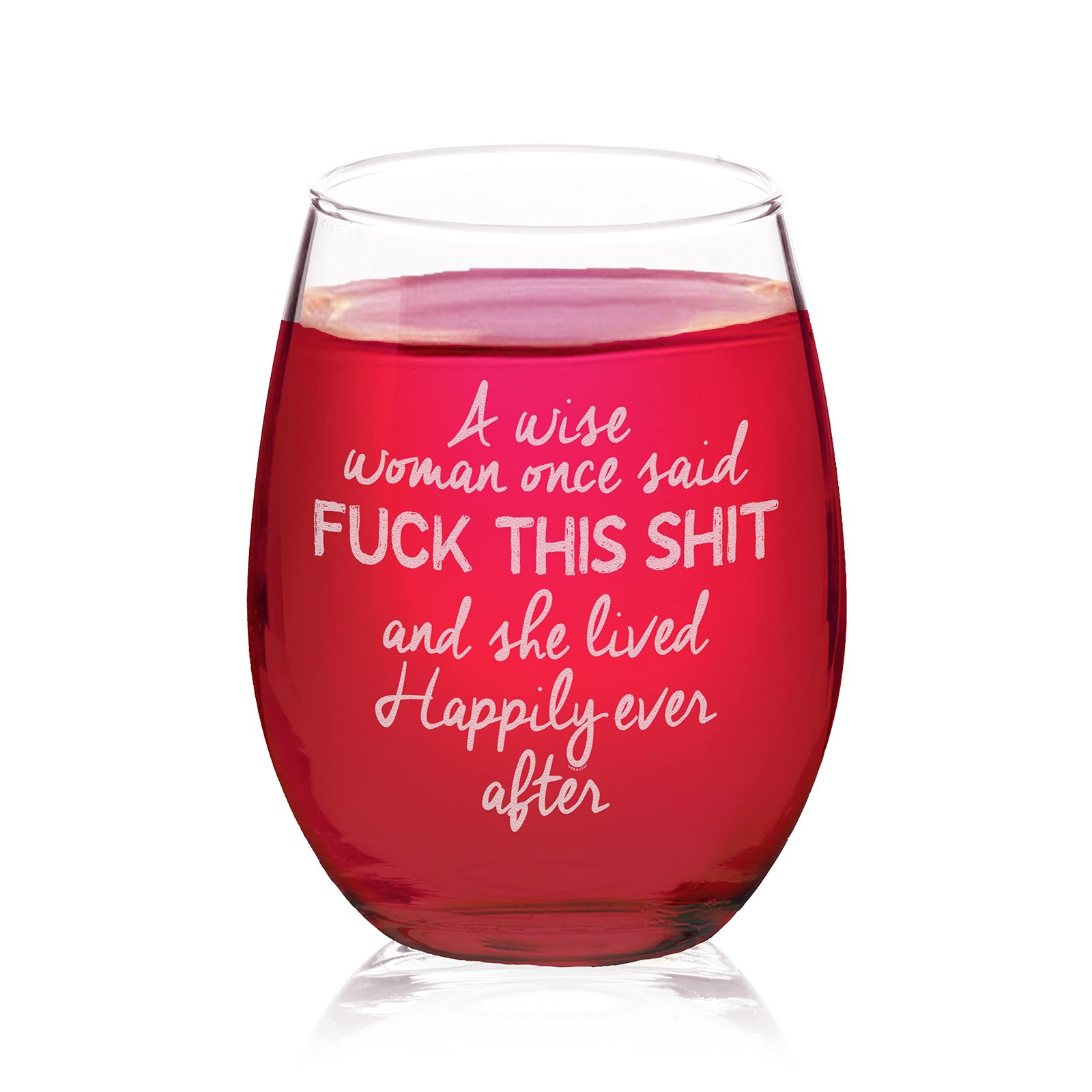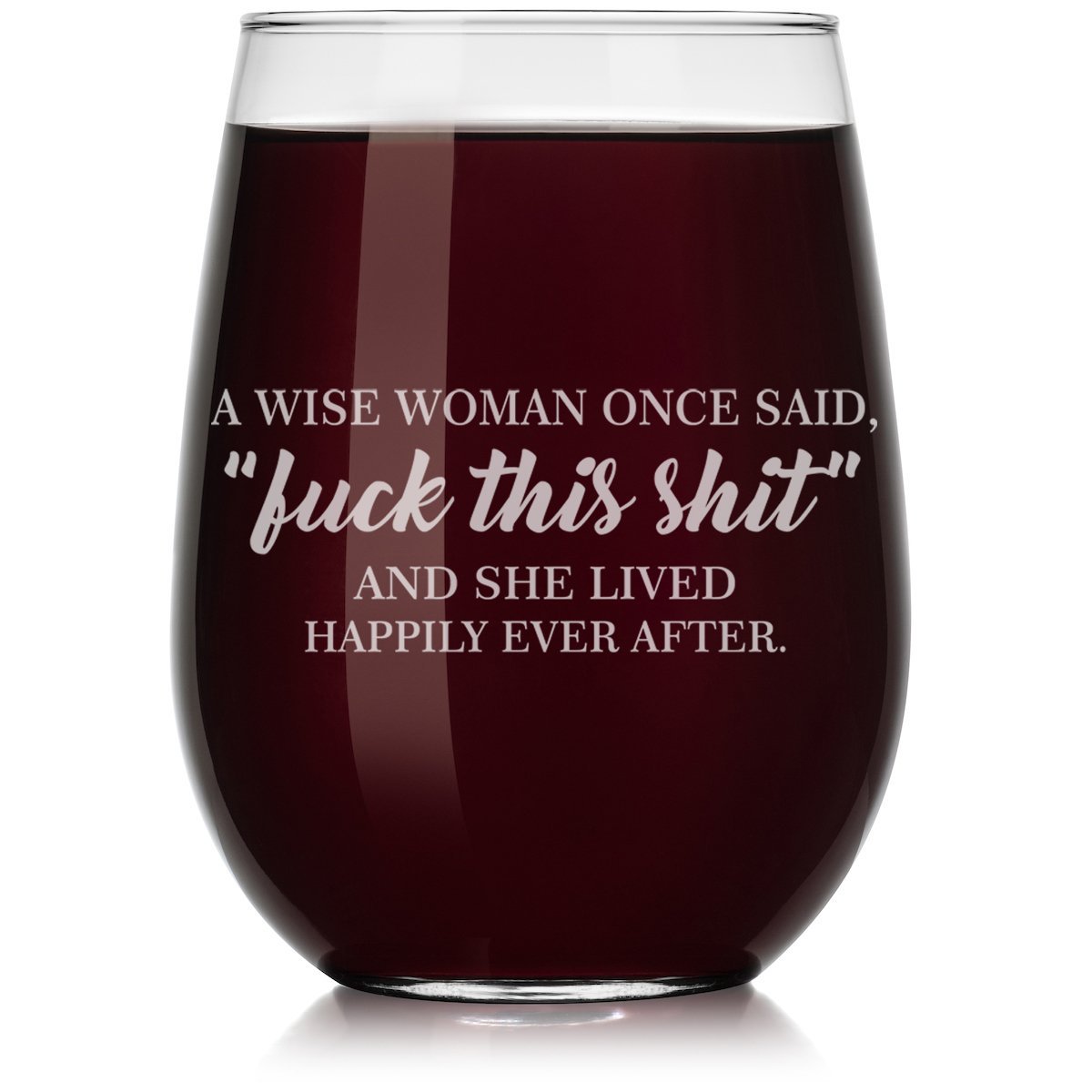 The A Wise Woman Once Said Stemless Wine Glass stands out with its charming laser engraving.